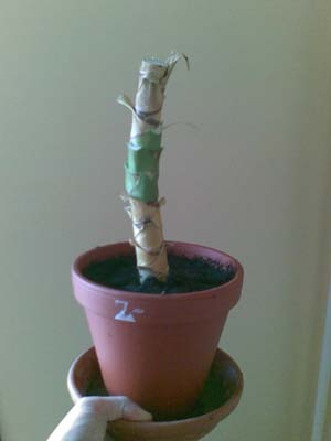 Mummilta peritty lähes metrinen jukkapalmu koki talven aikana kovia. Jukka kasvoi suurehkossa altakasteluruukusta, jossa se viihtyikin hyvin kasvukauden ajan. Talvella jukka haihdutti kuitenkin äärimmäisen vähän, mikä oli minulle yllätys. Juuret joutuivat olemaan joulukuussa seisovassa vedessä yli viikon. Kaadoin veden tuolloin täyttöaukosta ulos ja annoin ruukun kuivahtaa reilummin. Jukan lehdet nuokahtivat kuitenkin yksi toisensa jälkeen. Tammikuussa palmu otti kasvupyrähdyksen kasvattaen tiheän ja kiharan kärkikasvun. Vanhat lehdet ja nämä uudet lehdet jatkoivat kuitenkin kuolemista. Jaoin jukkapalmun tänään neljään osaan. Leikkasin varren terävällä veitsellä poikki 20 cm juurakon yläpuolelta ja vaihdoin juurille tuoreen mullan. Jäljelle jääneestä varresta leikkasin yhden noin 30 cm ja toisen lyhyen vain 10 senttisen palan ja istutin nämä kosteaan multaa tyvipää alaspäin juurtumaan. Varren kärjen jossa oli uudet lehdet asetin vesilasiin kasvattamaan juuria. Toivottavasti lisäykset onnistuvat ja vesivahingosta on jotain hyötyä. Jukkapalmun hoito-ohjeet  Tunnisteet: kasvit